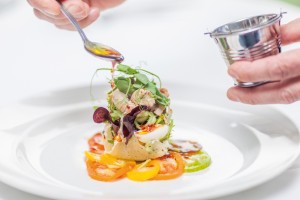 •Divide the dressed quail mix into 4 even amounts and place into the parmesan baskets. Use the colour of the eggs as your garnish; drizzle a small amount of the dressing over the tomatoes also, and serve